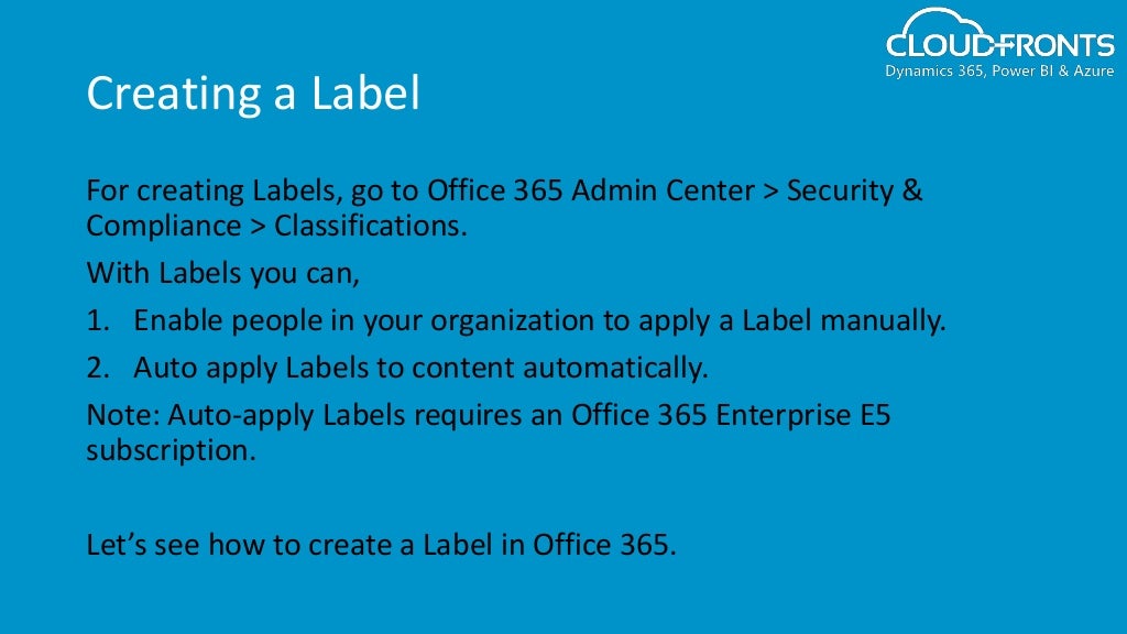 Demystifying Labels in Office 365 | by Joanne Klein - Medium These labels are created in the Security & Compliance Center in Office 365 at protection.office.com. As of the time of this writing (December 2019), you will see it under the Classifications navigation heading. Q4: What are good things to know about this label?